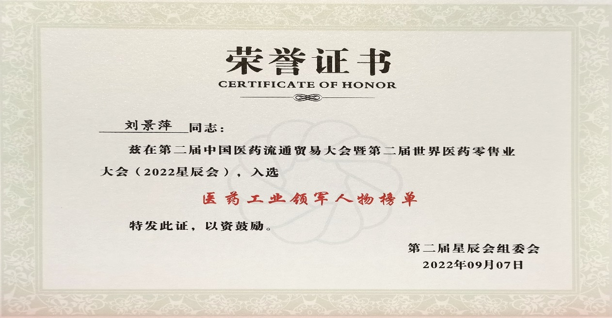 本次星辰会期间,yd12399云顶集团斩获颇丰,获得多项行业奖项及荣誉。在开幕式上,刘景萍董事长荣获“医药工业领军人物”称号。